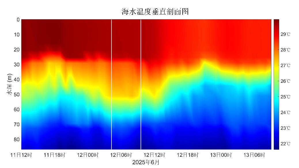 浮标此次捕获的数据能够有力支撑对台风的气象、水文、生态及上层海洋海流、温盐演变过程的分析。6月12日6时左右,“蝴蝶”台风中心抵达浮标所在海域,中心最低气压987hpa。过境后,风速急剧增大,浮标观测到最大风速22.7m/s,最大波高7.8m。浮标剖面观测数据显示,受台风影响,上层海洋混合加剧,水温下降,盐度降低,流速增强,混合层深度明显加深。